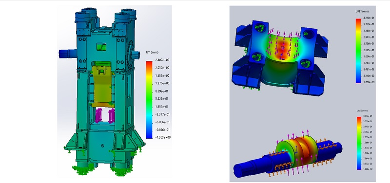 威榮精鍛的產(chǎn)品,以清華大學(xué)教材《曲柄壓力機》和《熱模鍛壓力機》為設(shè)計參考,吸取國內(nèi)外優(yōu)秀機型的優(yōu)點進(jìn)行設(shè)計;在設(shè)計完成后,通過計算機有限元分析,模擬出各個關(guān)鍵點的位移變量,皆優(yōu)于同類型機型,整體剛性更是高于標(biāo)準(zhǔn)近3倍。在制造完成之后,還要通過噸位達(dá)標(biāo)測試和剛性檢驗才可出廠驗收,保證能力足夠大,機身足夠硬。