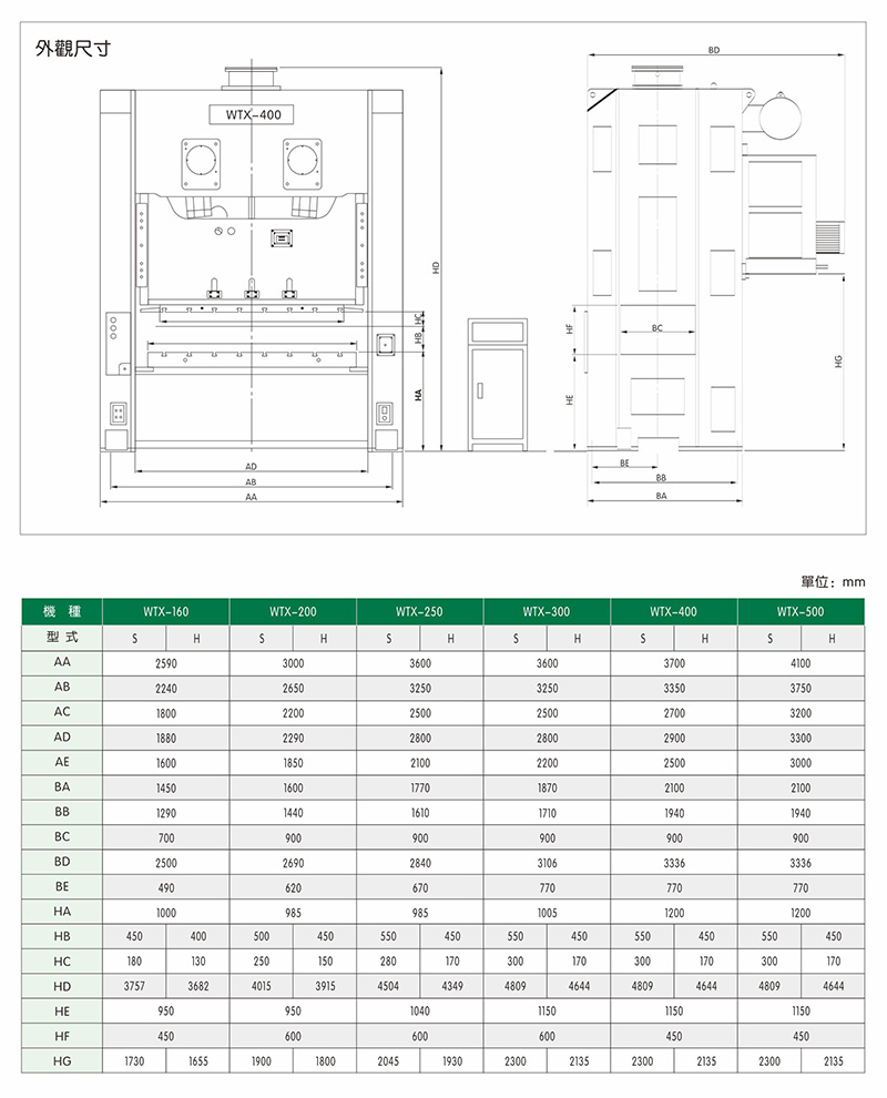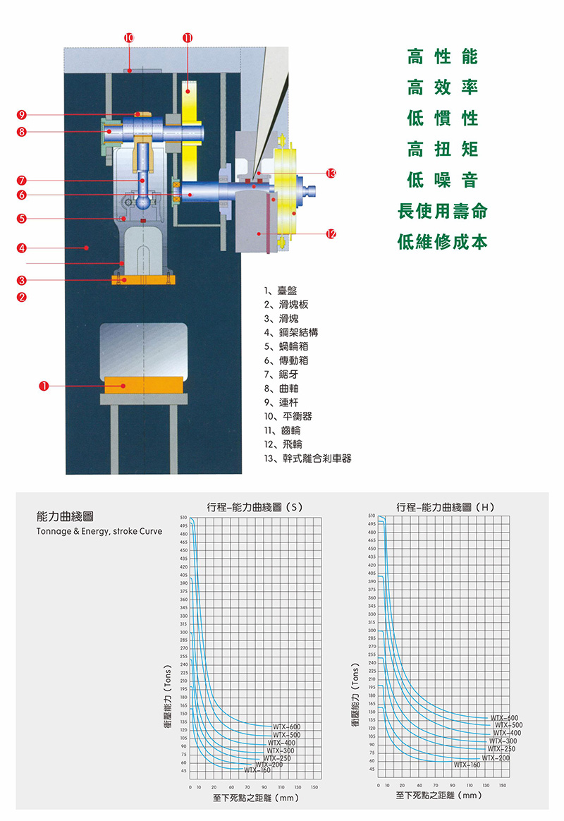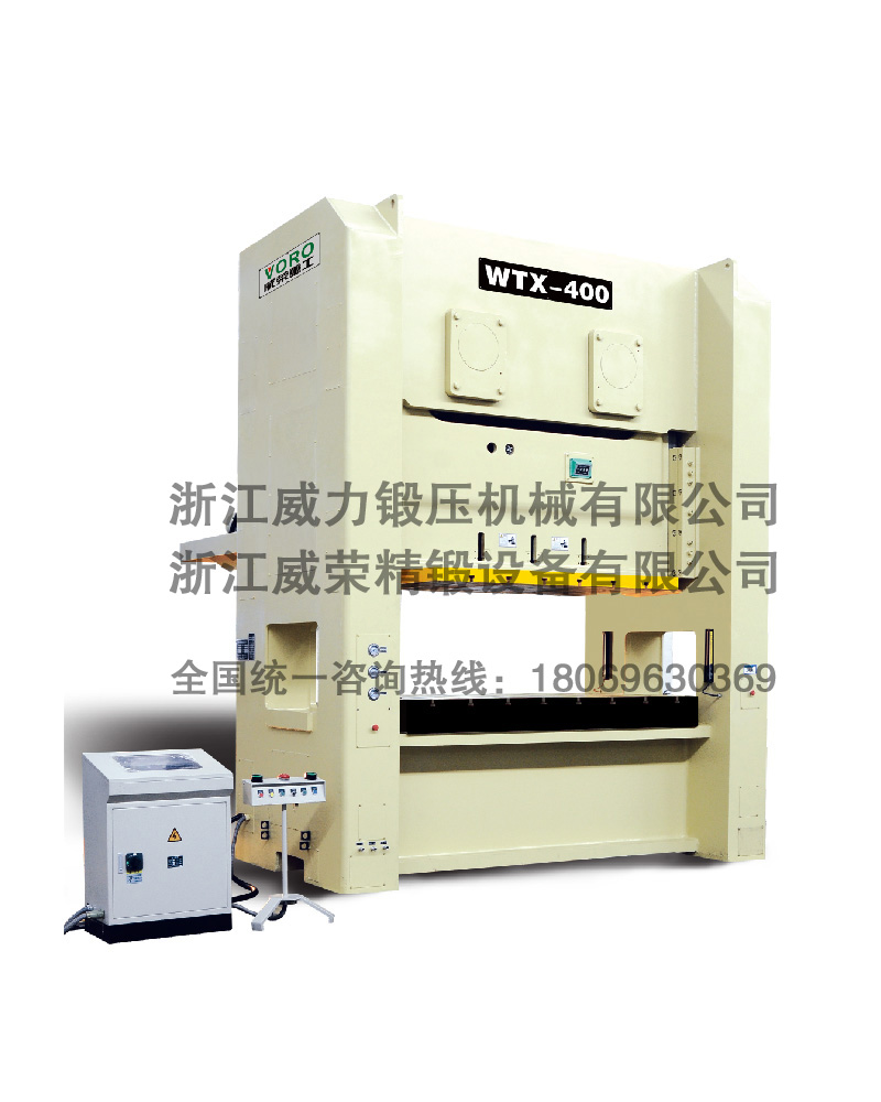 WTX系列沖床機身具有極高之剛性、良好之精度及較大之床面,可適用連續(xù)加工順送之下料、沖孔、成形、引伸等加工,并可選擇性加裝移動臺車,以達快速換模之目的。此種機型特別適用于汽車、摩托車、五金、家電等制品之沖壓加工。